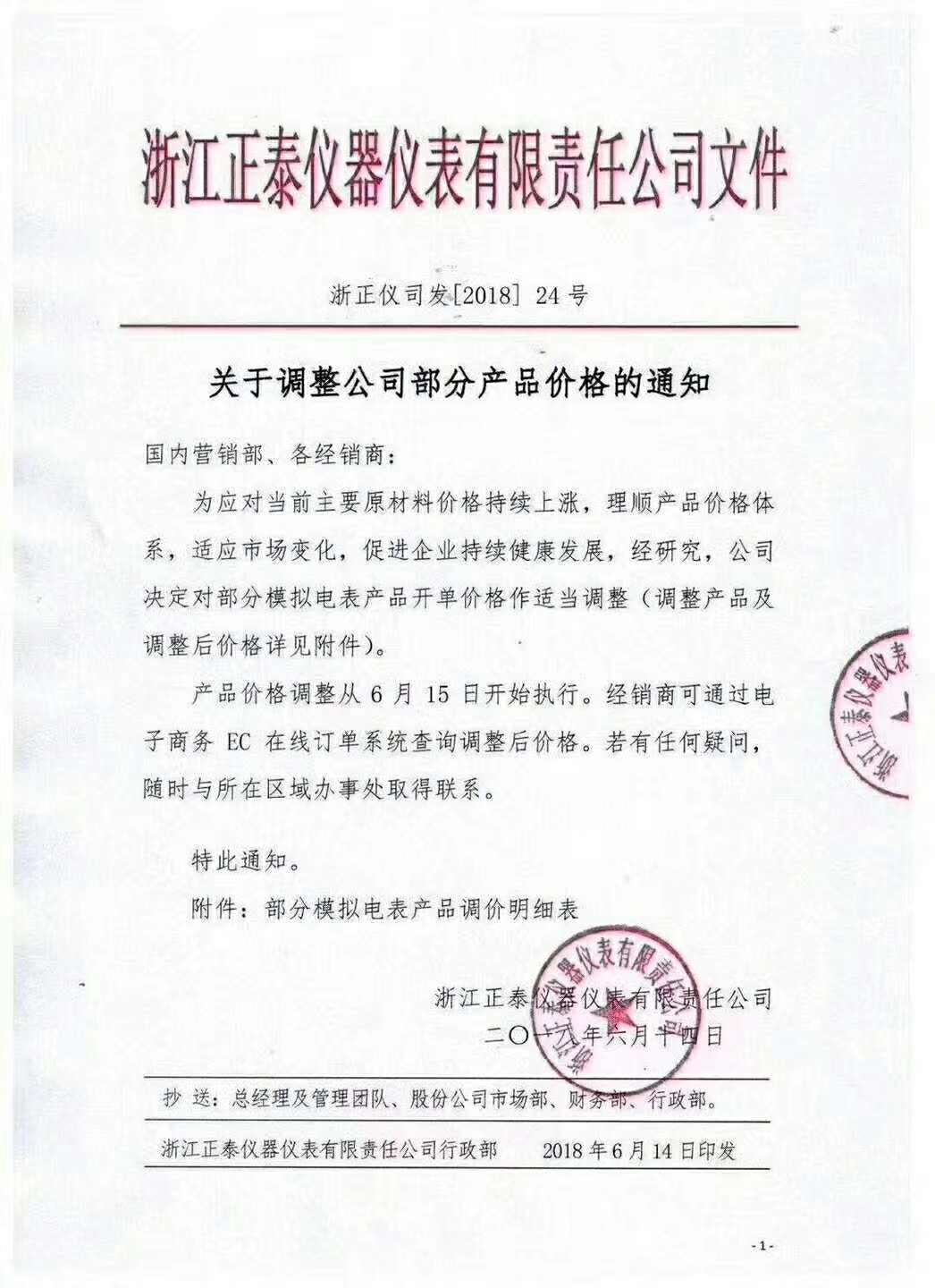正泰電器關(guān)于部分模擬電表產(chǎn)品價(jià)格上漲的通知
